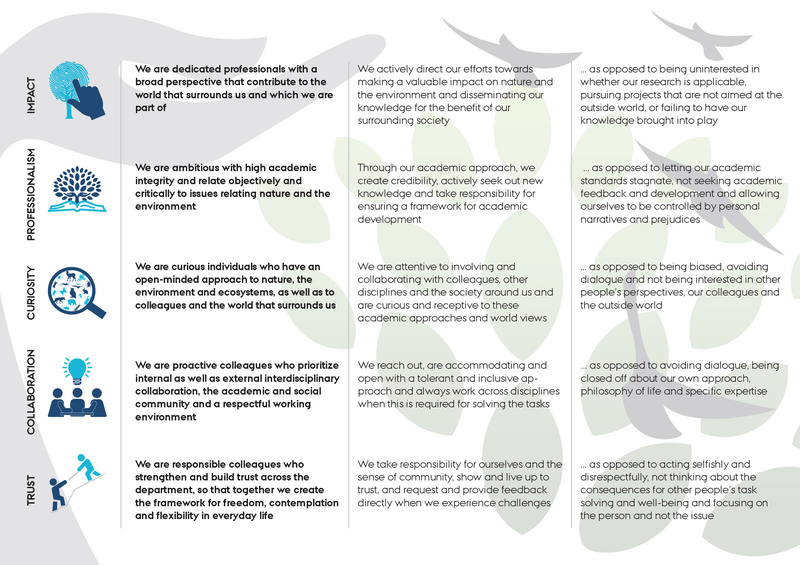 The Department of Ecoscience makes a valuable impact on nature and the environment through high academic standards, professionalism and curiosity, based on cooperation and trust . Our values are: