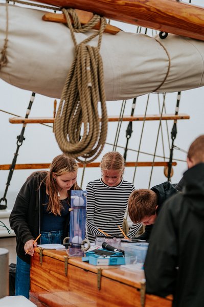 Ombord på den 103 år gamle skonnert møder eleverne både havforskning, kulturhistorie, sømandskab og sansemættede oplevelser. De indsamler prøver fra havbunden, undersøger tang og smådyr i stereolupper og oplever med egne sanser, hvad iltsvind betyder for livet i havet.