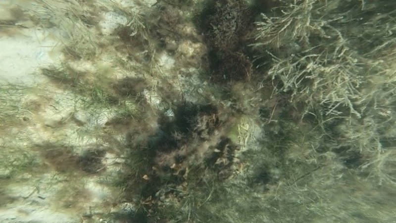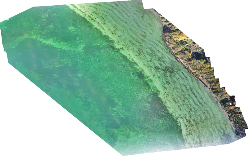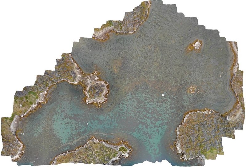 The drone images here are recorded at low tide, and the mosaic shows the tidal vegetation as a small brown strip along the coast, while submerged seaweed appears as brown fields/patterns in deeper water in the bay.