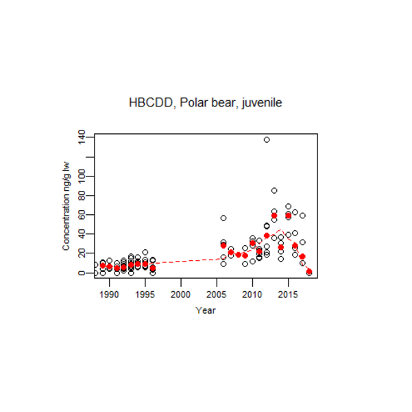 One example is the flame inhibitor hexabromocyclododecane (HBCDD), where studies of the trend in concentration levels in Arctic animals have not given a clear answer. In Greenland's polar bears, the concentration in recent years seems to have declined after having increased up to 2015. In 2013, HBCDD was added to the Stockholm Convention's list of substances where production should be discontinued or restricted. Monitoring in the coming years will show whether this decreasing trend continues.