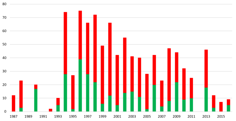 Det største samlede antal individer af sværd-skovlilje blev registreret i 1994 og 1996, hvor henholdsvis 46 og 36 blomstrende og 28 og 39 vegetative planter blev registreret fordelt på 5 og 6 lokaliteter. Det laveste antal blev optalt i 1992 med 2 blomstrende planter på én lokalitet (Fig. 1). Det højeste gennemsnitlige antal blev i 1988 optalt med 20 blomstrende og 3 vegetative planter i én bestand, nemlig den i Grund Skov (Fig. 2).
