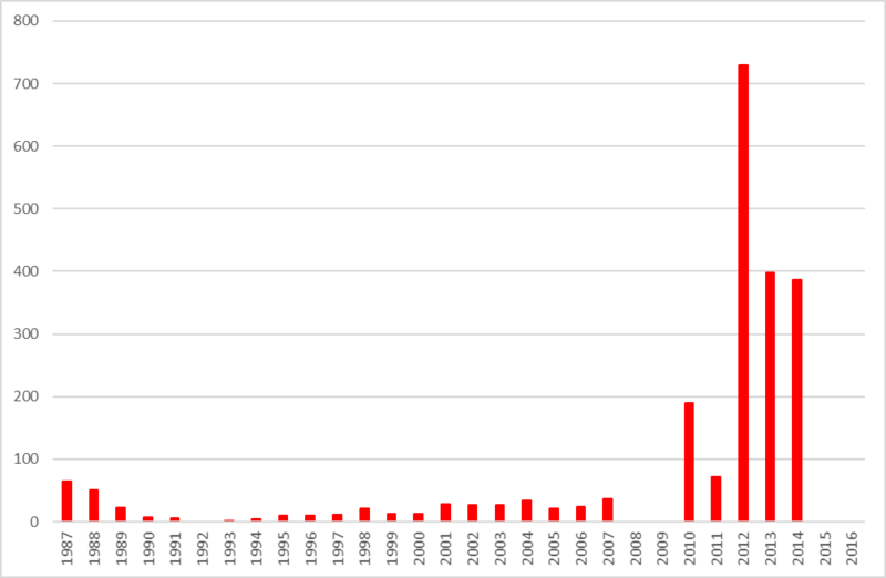 I perioden 1987-2007 svingede det gennemsnitlige antal af hvidgul gøgeurt mellem én og 64 blomstrende planter med betydelige årlige antalsforskelle. I perioden 2010 til 2014 blev der optalt et betydeligt større antal blomstrende planter på lokaliteten på Tuse Næs alene, idet minimum var 190 og det maksimale antal var 729 (Fig. 1). Den store stigning i antallet af blomstrende planter skyldes skift af overvåger og metode. I perioden 1993-2003 blev hvidgul gøgeurt optalt i et 4x10 m2 stort prøvefelt som følgeart for tætblomstret trådspore, mens orkidéen i perioden 2010-2014 her blev totaloptalt som den primære orkidé på hele lokaliteten, der strækker sig fra Staslundevej til Hønsehalsen på Tuse Næs.