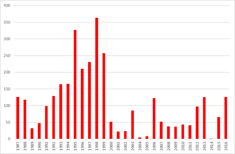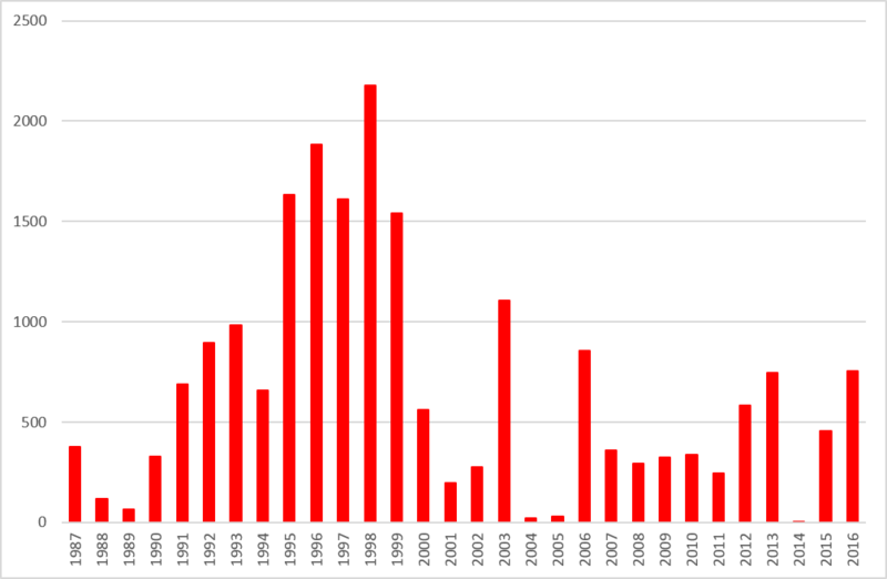 Op gennem 1900’erne steg det samlede antal til et maksimum på 2.178 blomstrende planter i 1998, hvor også det højeste gennemsnitlige antal blomstrende planter forekom (Fig. 1 og 2). Efter årtusindskiftet faldt det gennemsnitlige antal blomstrende planter drastisk, hvilket er en halvering eller mere sammenlignet med antallet i slutningen af 1990’erne. Medvirkende hertil er, at Rævebjerg bestanden ikke blev optalt mellem 2000 og 2005 bortset fra i 2003 og heller ikke i 2014. De overvågede bestande af hylde-gøgeurt rummer alt fra et fåtal på 19 fordelt på 5 lokaliteter i 2004 til 2.178 blomstrende planter fordelt på 6 lokaliteter i 1998. Det højeste antal 1.019 blomstrende planter på en enkelt lokalitet blev optalt i Rævebjerg bestanden i 1999, mens det næsthøjeste antal 982 blev optalt i 1996 på Bornholm i Kåsegård bestanden, som på det tidspunkt var landets største bestand.