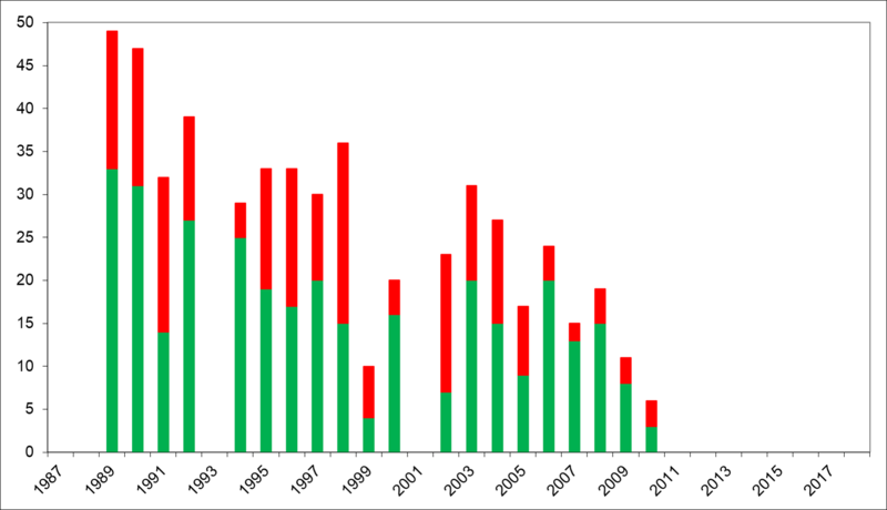 Det højeste antal både blomstrende og vegetative skud 49 blev optalt i 1989, mens det største antal blomstrende skud 27 blev optalt i 1992. Det laveste antal skud blev optalt i 2010 med tre vegetative og tre blomstrende skud - seks i alt (Fig. 1).