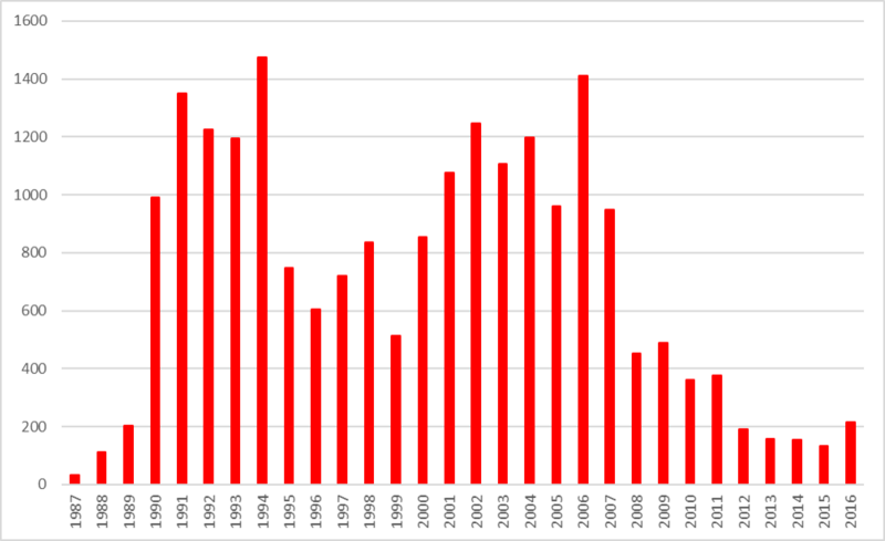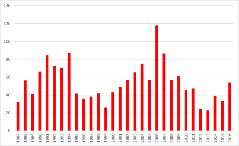 Det højeste og næsthøjeste samlede antal blomstrende skud på 1.474 og 1.410 fordelt på 17 og 12 lokaliteter blev optalt i henholdsvis 1994 og 2006, hvor det højeste gennemsnitlige antal blomstrende skud på 118 blev registreret (Fig. 1 og 2). Det laveste antal 32 blev optalt på Vorsø i 1987. Det største antal blomstrende skud 1.028 på en enkelt lokalitet blev optalt Jordløse Bakker i 1994. Det laveste gennemsnitlige antal blomstrende skud på 23 fordelt på 7 lokaliteter blev registreret i 2013.