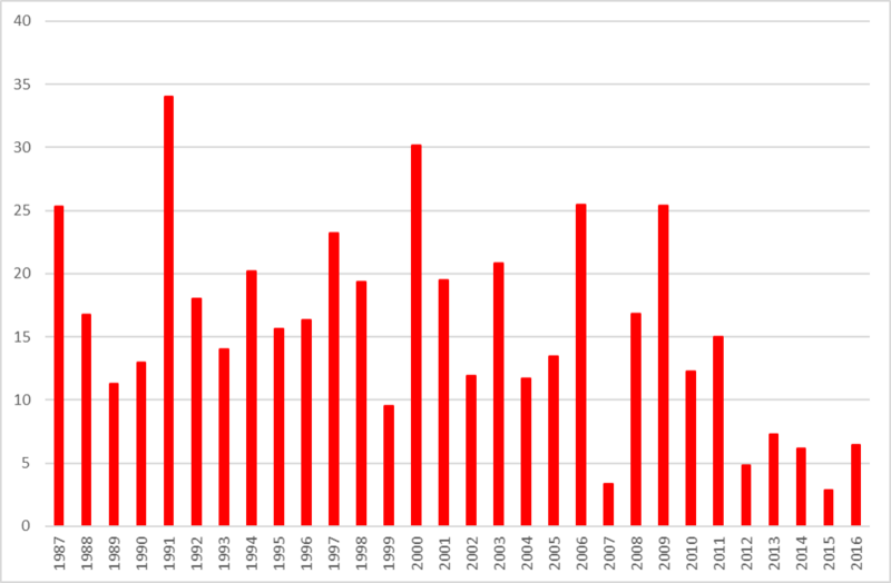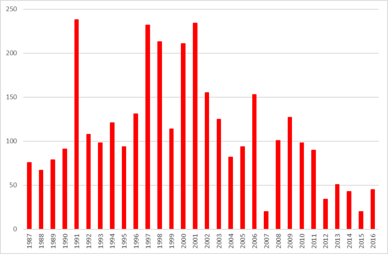 Bestanden i Havreballe skov har været overvåget kontinuert i hele 30 års perioden bortset fra et par år på grund af skift af overvåger. Overvågningen af bestanden i Karlsskov på Røjle Halvøen på Fyn blev påbegyndt i 1990 og blev overvåget kontinuert i resten af 30 års perioden. Det største antal på mellem 10 og 13 bestande blev overvåget i perioden 1997-2002 bortset fra 2000, hvor kun syv blev overvåget.