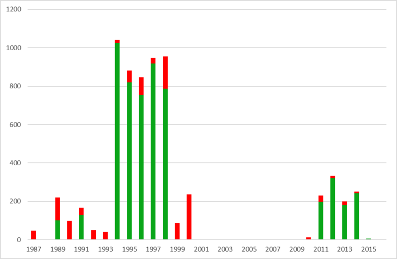 Overvågningsindsatsen har været heterogen såvel i tid som metodisk. De vegetative knærod-skud er blevet talt med i nogle år og udeladt i andre. Der kan således tælles mange vegetative skud selv i et lille prøvefelt, som tilfældet var det i Svinkløv Plantage. Her blev der i det ene felt med en størrelse på 10 m2 optalt 700 vegetative og 158 blomstrende skud i 1998 (Fig. 1).