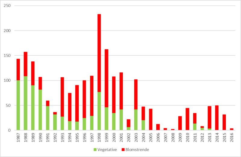 Både antallet af vegetative og blomstrende planter præsenteres, da begge skudtyper er blevet optalt næsten konsekvent årligt.