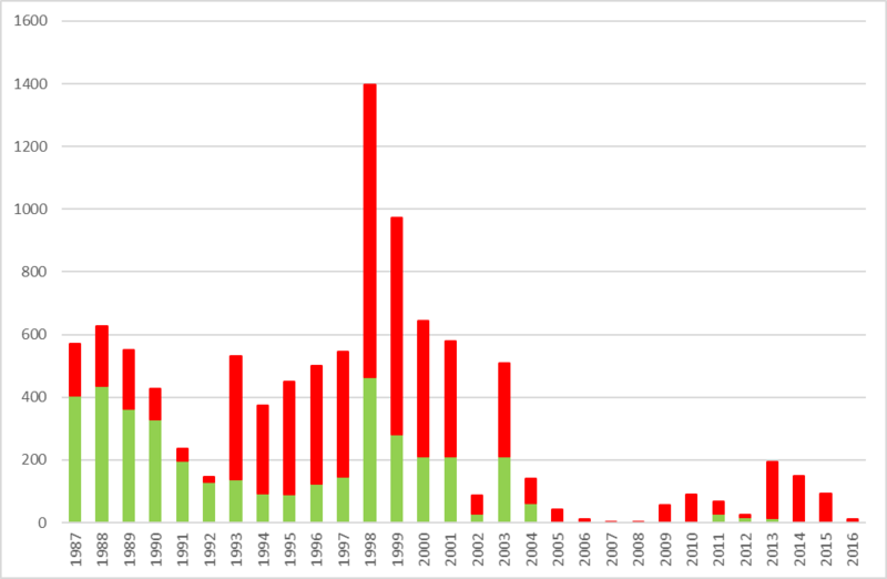 Det højeste samlede og gennemsnitlig antal på henholdsvis 1.397 og 155 pukkellæbeplanter fordelt på 6 lokaliteter blev registreret i 1998 (Fig. 1 og 2). Medvirkende hertil var, at der blev optalt 558 planter ved Liver Å, mens der ved Vandplasken blev optalt 280 blomstrende og 258 vegetative planter. Omvendt var både det samlede og det gennemsnitlige antal planter på under 10 i årene 2007-2009 og 2015-2016, hvor kun optællingerne af Høje Møn bestanden indgik.