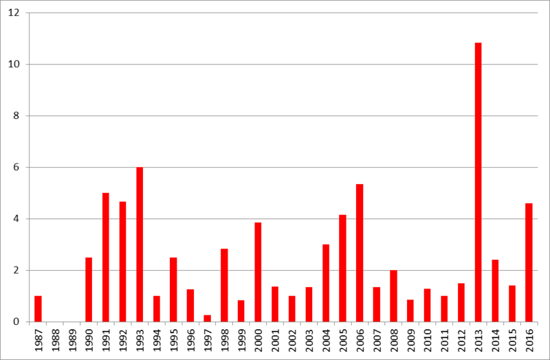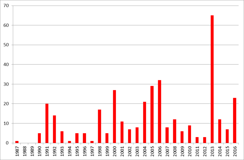 Overvågningen af rederod har vist, at der i de udvalgte bestande ofte optræder få overjordiske skud, og at de enkelte planter ofte forbliver underjordiske i en årrække efter en blomstring. Dette bevirker, at det samlede antal af overjordiske skud svinger meget fra år til år. Det højeste samlede og gennemsnitlig antal overjordiske skud på 65 henholdsvis 11 blev registreret i 2013 (Fig. 1 og 2). Det høje antal skyldes, at der i Staksrode bestanden blev registreret 50 skud.