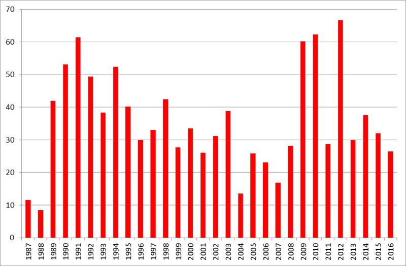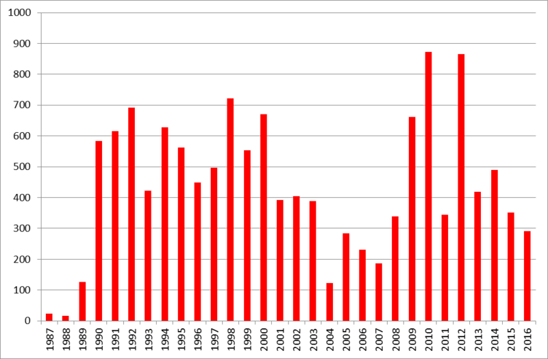 De største samlede antal blomstrende planter af ægbladet fliglæbe på 873 og 866 blev registreret i henholdsvis 2010 og 2012 fordelt på 14 og 13 bestande (Fig. 1), hvilket samtidig resulterede i de højeste gennemsnitlige antal på 62 og 67 blomstrende planter (Fig. 2). Det højeste antal på 457 blomstrende planter blev registreret i 2012 i bestanden ved Kyndby på Sjælland. I mange bestande er antallet af blomstrende planter encifret, da ægbladet fliglæbe ofte er en følgeart i forhold til den primære art for overvågningen f.eks. stor gøgeurt.
