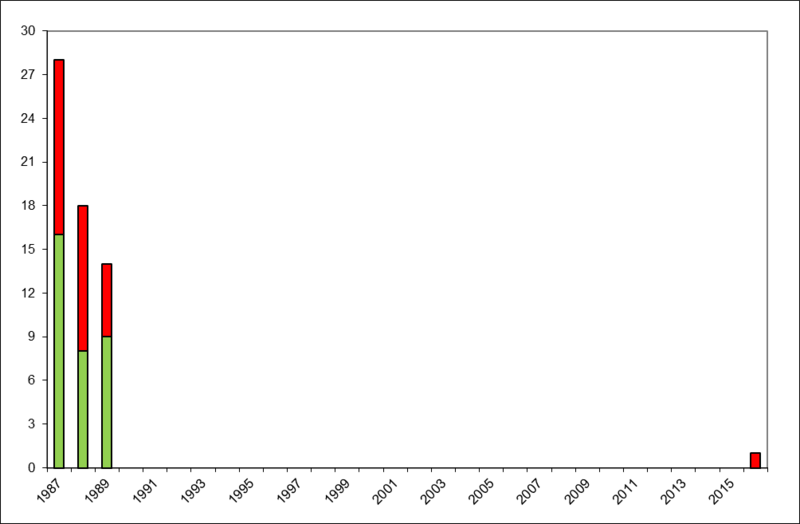Antallet af ridder-gøgeurt individer var maksimalt i 1987 med 12 blomstrende og 16 vegetative planter. Antallet faldt i 1988, og i 1989 blev der registreret 5 blomstrende og 9 vegetative planter (Fig. 1).