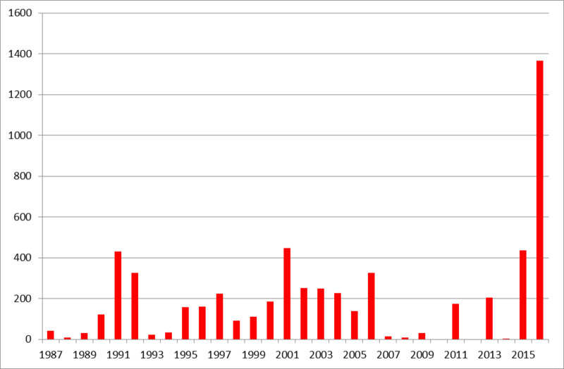 Den samme tendens afspejler sig i det gennemsnitlige antal blomstrende planter. Frem til 2015 svinger det gennemsnitlige antal mellem 1 fordelt på to bestande i 2014 og 44 fordelt på 4 bestande i 2011. Det gennemsnitlige antal stiger til 455 blomstrende planter fordelt på 3 bestande i 2016 på grund af bidraget fra den store fynske bestand (Fig. 2).