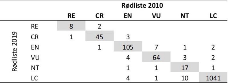 Tabel 1, svampe Krydstabel over rødlistekategorier for svampe i den nuværende (Rødliste 2019 med 113 behandlede arter) og forrige rødliste (Rødliste 2010 med 98 behandlede arter). RE: regionalt uddød ikke relevant og NE: ikke vurderet. ”Ikke behandlet” angiver arter, der ikke blev behandlet i 2010 eller 2019. De grå celler på tværs i tabellen angiver arter, der ikke har skiftet kategori mellem de to vurderingsrunder. Tal over de grå celler viser arter, der har fået en mere truet vurdering i 2019 end 2010, mens tal under de grå celler (i de første 7 rækker) viser arter med en mindre truet vurdering i 2019. Kategoriskift kan være reelle ændringer i, hvor truede arterne er, men kan også skyldes andre forhold, fx taksonomiske ændringer eller forbedret datagrundlag.
