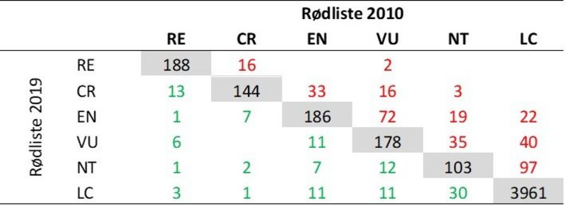 Tabel 1. Krydstabel over rødlistekategorier for alle arter i den nuværende (Rødliste 2019) og forrige rødliste (Rødliste 2010). RE: regionalt uddød, CR: kritisk truet, EN: truet, VU: sårbar, NT: næsten truet, DD: utilstrækkelige data, LC: livskraftig, NA: ikke relevant og NE: ikke vurderet. ”Ikke behandlet” angiver arter, der ikke blev behandlet i 2010 eller 2019. De grå celler på tværs i tabellen angiver arter, der ikke har skiftet kategori mellem de to vurderingsrunder. Tal over de grå celler viser arter, der har fået en mere truet vurdering i 2019 end 2010, mens tal under de grå celler (i de første 7 rækker) viser arter med en mindre truet vurdering i 2019. Kategoriskift kan være reelle ændringer i hvor truede arterne er, men kan også skyldes andre forhold, fx taksonomiske ændringer eller forbedret datagrundlag.