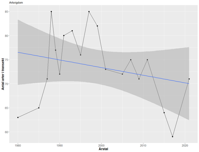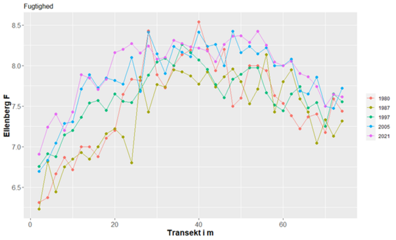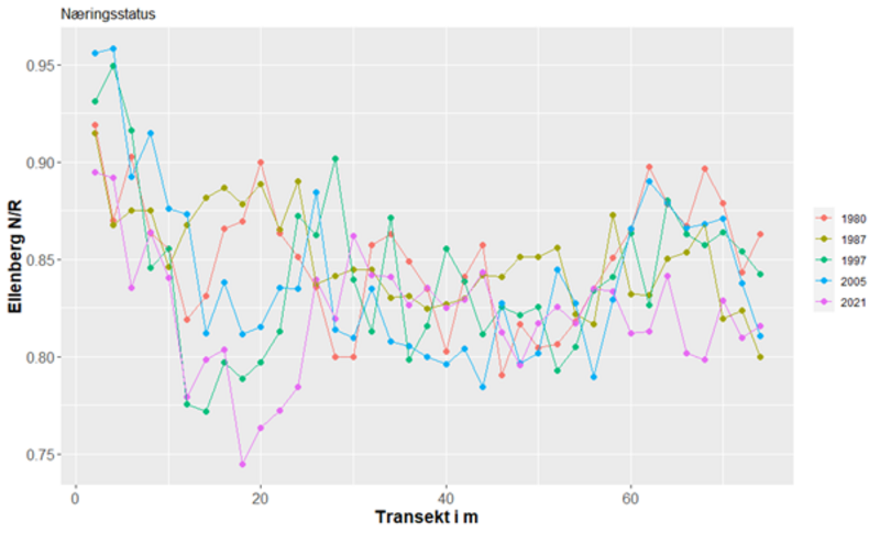 Transekten på 74m er delt op i 37 felter på hver 2x2m. I hvert felt vurderes dækningen i % for hver af de forekommende plantearter. I dette felt dominerer kær-star, som har en dækning på 100%. Der kommer ikke meget lys ned til bunden, men feltet har dog også forekomst af lyse-siv og den gulblomstrede sump-kællingetand. I hvert felt kan der forekomme flere lag i vegetationen således at den totale dækning kan overstige 100%