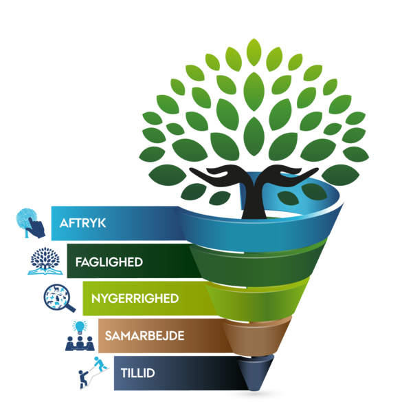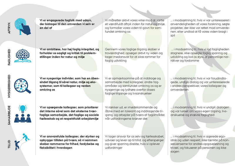 Institut for Ecoscience sikrer et værdifuldt aftryk på natur og miljø gennem høj faglighed og nysgerrighed, som bygger på samarbejde og tillid. Vores værdier er: